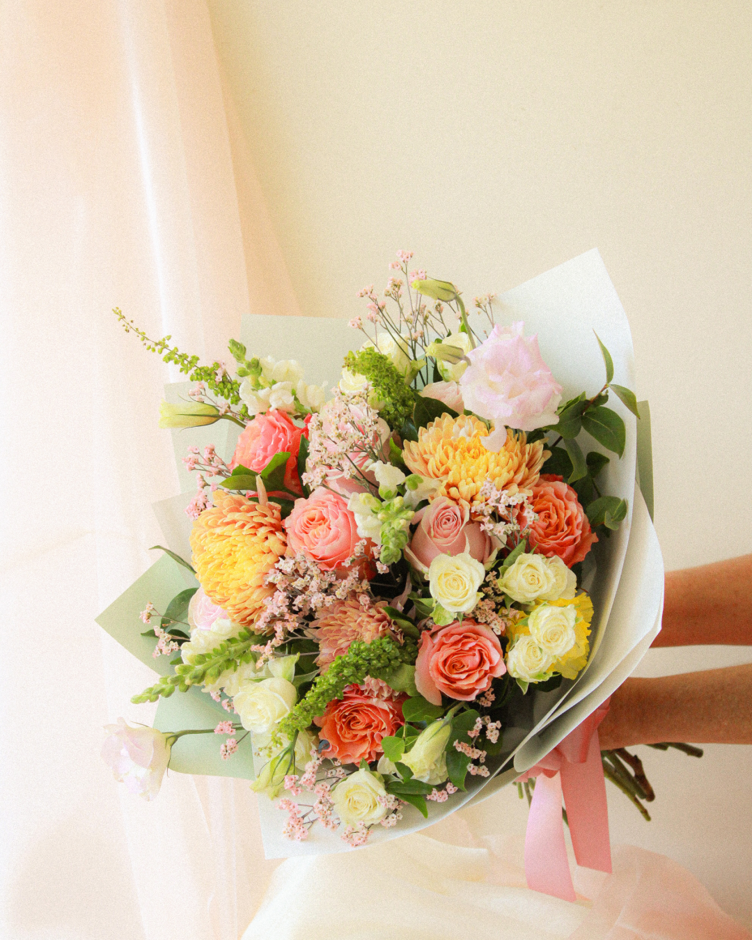 Combinación de rosas rosadas y carpe diem, crisantemos, mini rosa blanca, lisianthus, dragón, limonium, eucalipto y toques de follajes variados sueltos.