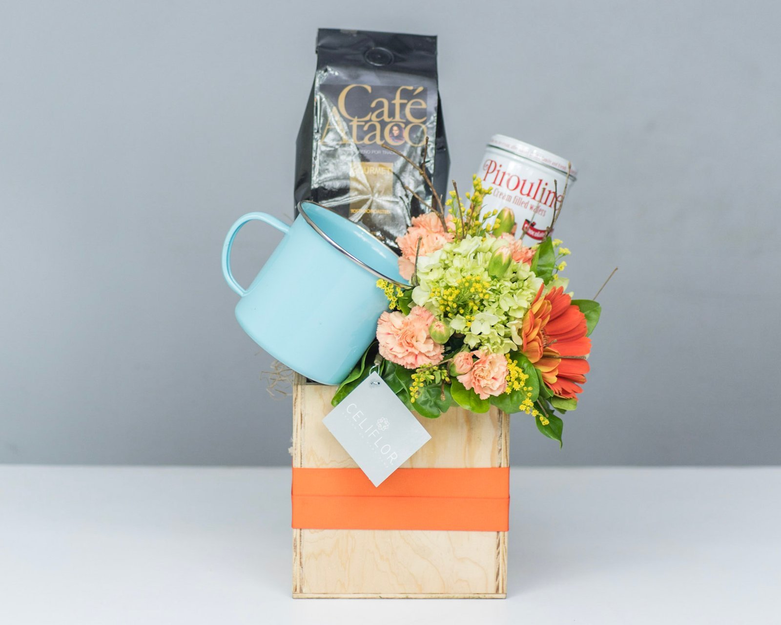 Caja de madera con bolsa de café, taza y Pirulines.