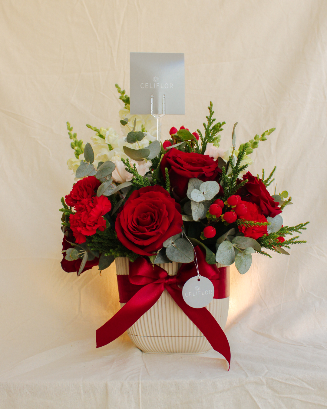 Arreglo mediano de rosas rojas, stock/dragón blanco, claveles rojos y rosados, hipericum rojo, eucalipto y toques de follajes variados sueltos.