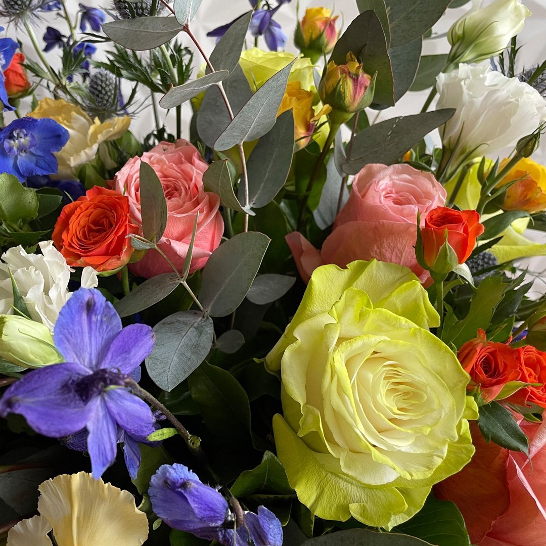 Rosas en tono verde y naranja, mini rosa amarilla y naranja, lisianthus blanco, eryngium, spray delphinuim y toques de eucalipto.