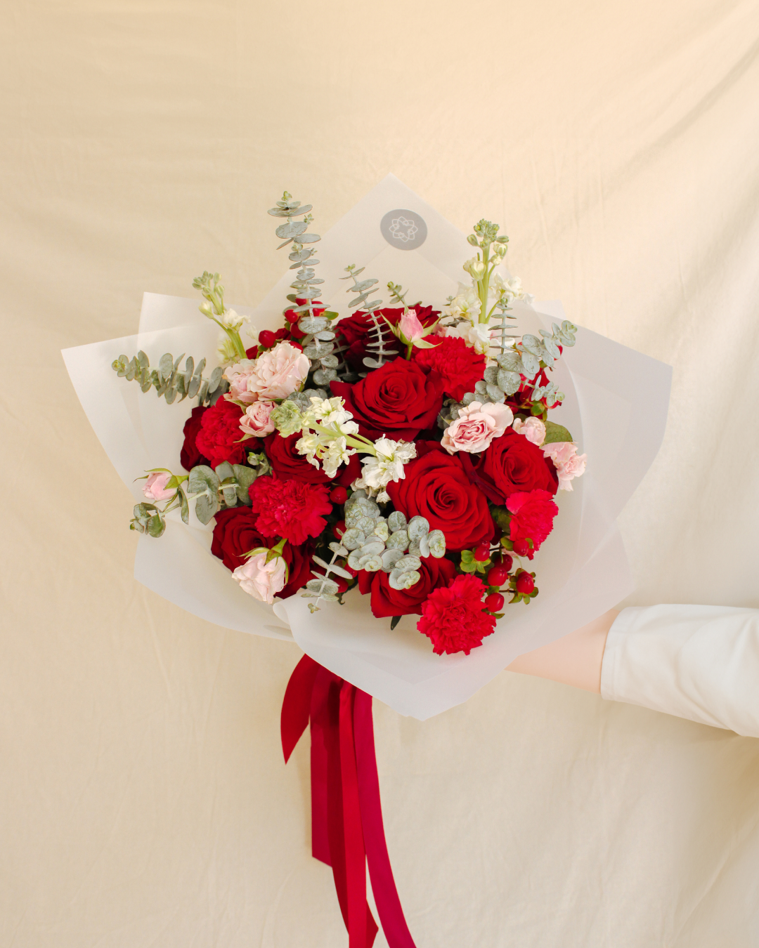 Rosas rojas, mini rosa rosada, stock blanco, hipericum rojo, claveles rojos y toques de eucalipto.