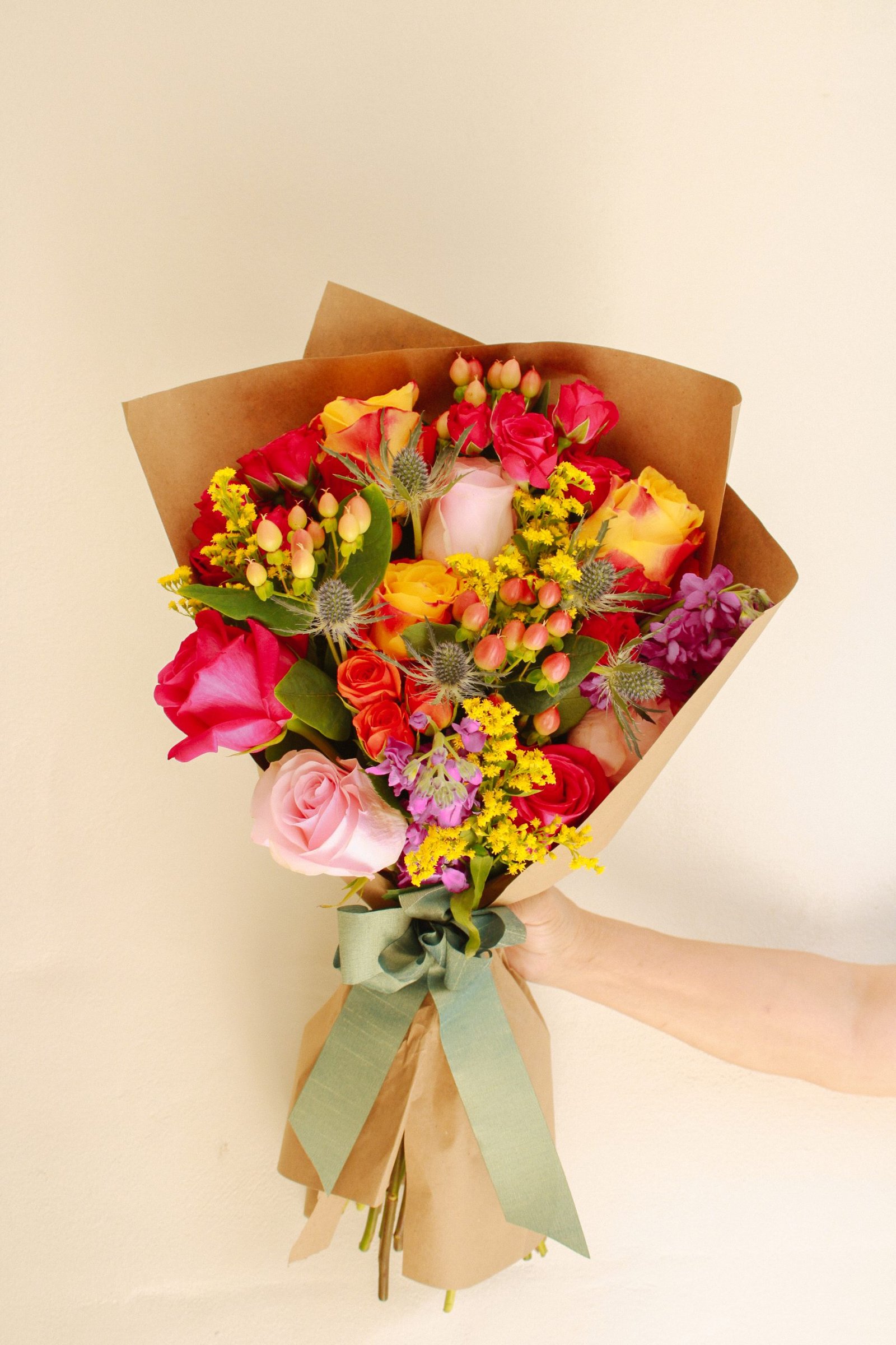Envuelto en doble papel encerado especial Celiflor y adornado con un lazo verde, este ramo artesanal celebra la vitalidad y el color del verano salvadoreño. Perfecto para regalar en cumpleaños, agradecimientos o celebraciones especiales, llenando cualquier espacio de luz y optimismo.